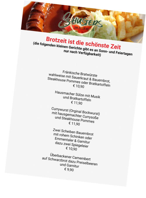 Guten AppetitWir freuen uns, wenn Sie das Schuster´s besuchen. Wir haben Ihnen eine Auswahl an leckeren Gerichten zusammengestellt. Sollten Sie nicht das passende finden, sprechen Sie mit uns. Gerne lassen wir uns etwas einfallen…Wir sind Frische-Freaks, den Frisch schmeckt es am Besten. Deshalb wollen wir ganz genau wissen woher unsere Lebensmittel kommen und wir legen Wert auf regionale Frische.Auszug aus unser Lieferantenliste: Gemüsebau Zimmermann, Fischzucht Müller, Frischdienst Walther, Wehner Groma Schweinfurt. Besuchen Sie uns und genießen Sie unsere Leckereien, gleich ob im Restaurant oder unserem schönen Biergarten. Wir freuen uns auf Sie und wünschen Ihnen schöne Stunden im Schuster´s zur Zellerau. Ihre Familie Schuster und Team