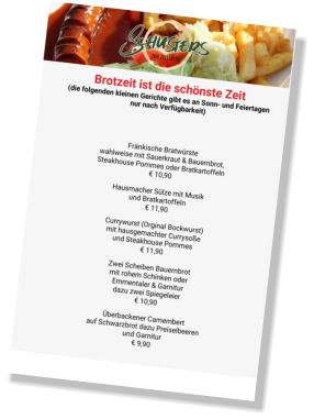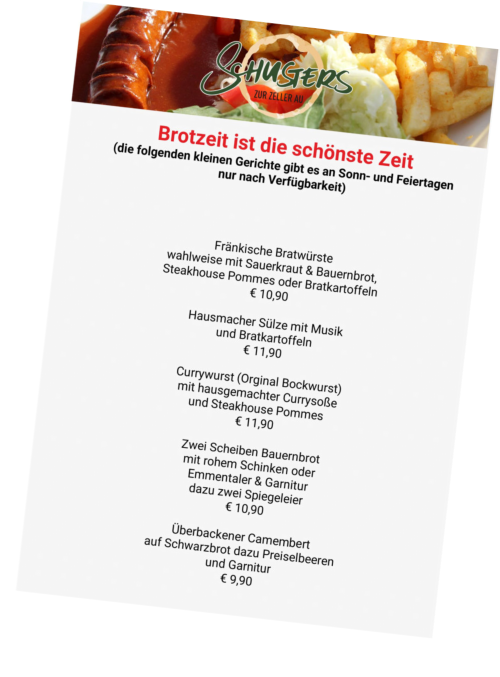 Guten AppetitWir freuen uns, wenn Sie das Schuster´s besuchen. Wir haben Ihnen eine Auswahl an leckeren Gerichten zusammengestellt. Sollten Sie nicht das passende finden, sprechen Sie mit uns. Gerne lassen wir uns etwas einfallen…Wir sind Frische-Freaks, den Frisch schmeckt es am Besten. Deshalb wollen wir ganz genau wissen woher unsere Lebensmittel kommen und wir legen Wert auf regionale Frische.Auszug aus unser Lieferantenliste: Gemüsebau Zimmermann, Fischzucht Müller, Frischdienst Walther, Wehner Groma Schweinfurt. Besuchen Sie uns und genießen Sie unsere Leckereien, gleich ob im Restaurant oder unserem schönen Biergarten. Wir freuen uns auf Sie und wünschen Ihnen schöne Stunden im Schuster´s zur Zellerau. Ihre Familie Schuster und Team